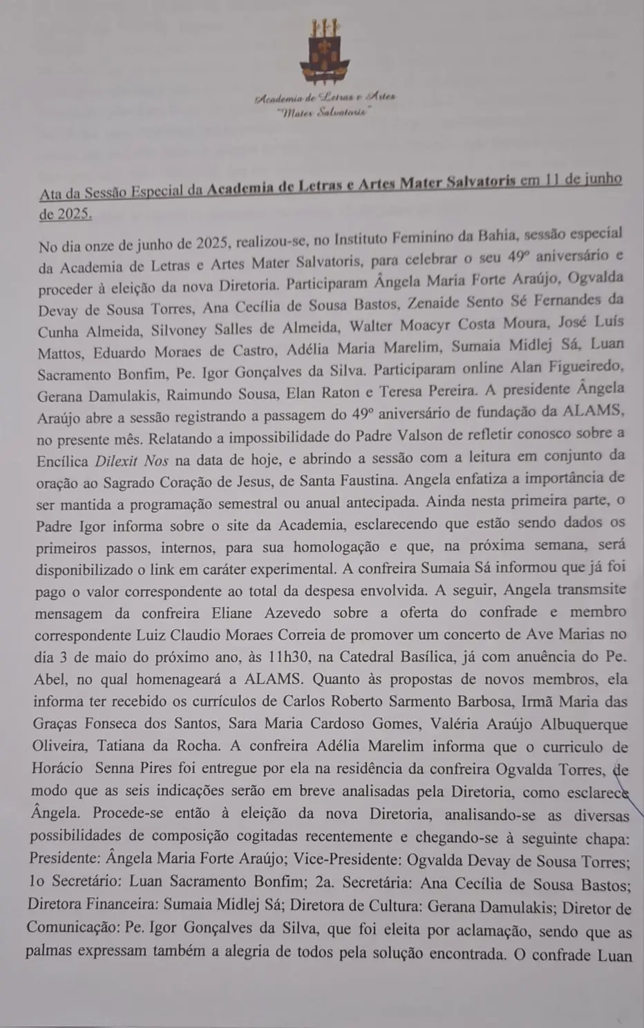 No dia 11 de junho de 2025, a Academia de Letras e Artes Mater Salvatoris (ALAMS) comemorou seu 49º aniversário com uma sessão especial realizada no Instituto Feminino da Bahia. O encontro também marcou a eleição da nova diretoria da instituição.